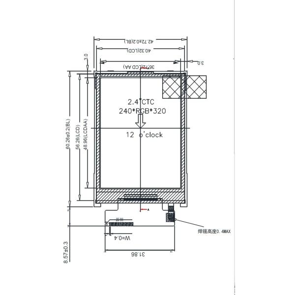 | 2.4 | YT024T012-V12 | 240x320 | 42.72 | 60.26 | 2.30 | P0.8/W0.4 | MCU低8bit | 37 | NV3029 |